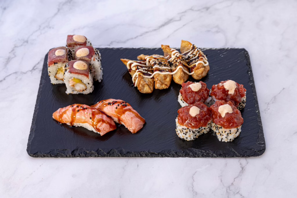 4 Giozas a elegir (pollo,gamba,verduras) 2 Niguiris salmon flambeado 4 ura de atun picante 4 ura Honolulu 2 mochis a elegir (Chocolate, cheesecake, pistacho,chocolate blanco y almendra)